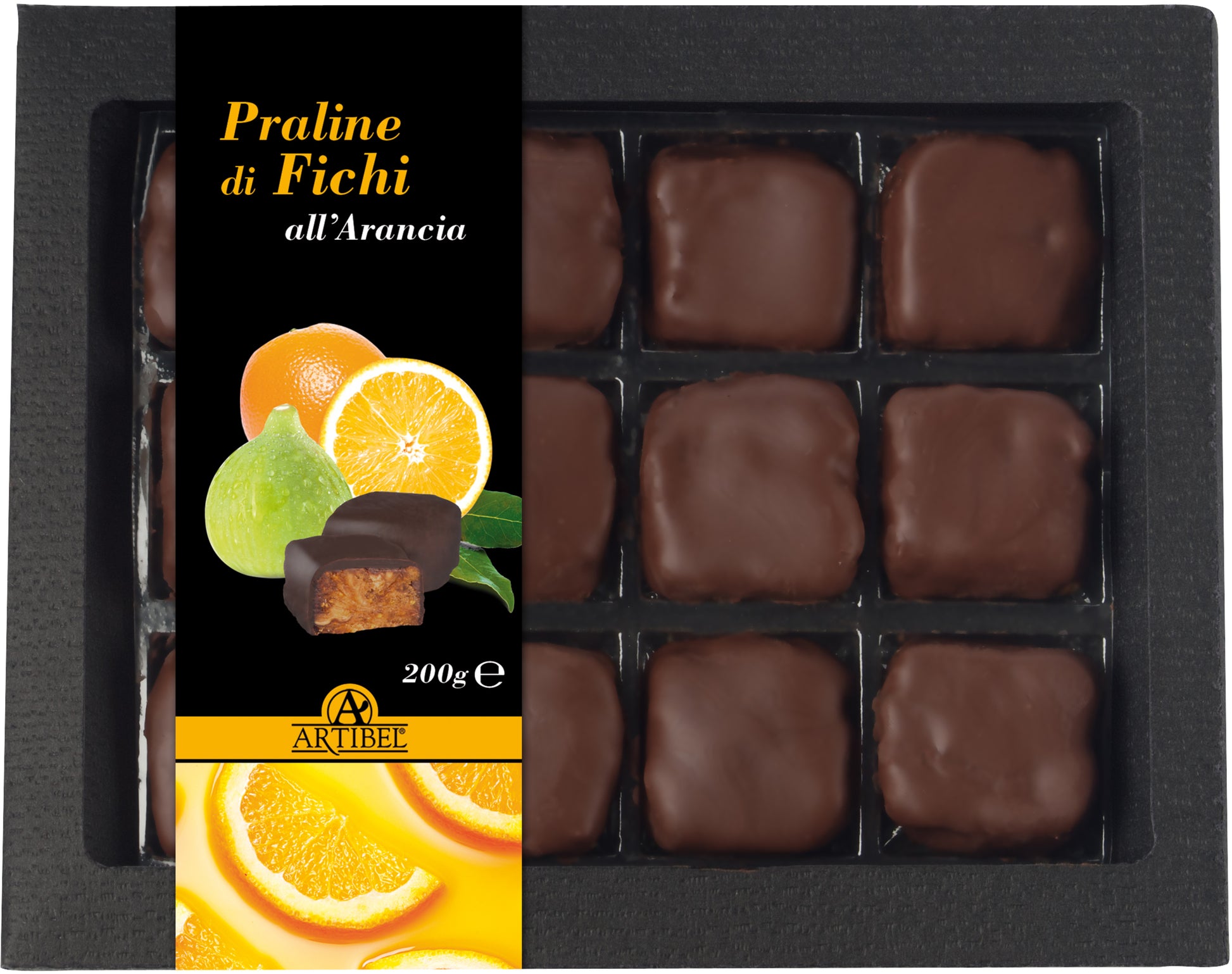 Tradizionali Fichi Secchi Infornati, 100% italiani – Calabria, qualità “Dottato” di Cosenza, tritati e agglomerati in praline, ricoperti con Cioccolato Fondente italiano, con l'aggiunta di arancia candita di Calabria. Fatto da fichi selezionati singolarmente, prodotti in Filiera Corta Artibel controllata; un prodotto ricco di polpa, con semi finissimi, aromatico e naturalmente dolce, senza aggiunta di zuccheri, conservanti o additivi chimici. Un prodotto che porta con sè tutto il gusto autentico della tradizione gastronomica Calabrese.